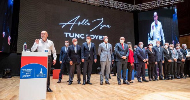 31 Mart 2019’da yapılan yerel seçimlerde yüzde 58’in üzerindeki oy oranıyla tarihi bir başarı elde eden İzmir Büyükşehir Belediye Başkanı Tunç Soyer, görevdeki ilk 550 gününün değerlendirmesini kentin farklı kesimlerinden temsilcilerin davet edildiği bir toplantıyla yaptı. Ahmed Adnan Saygun Sanat Merkezi’nde “İzmir’de Başka Bir Hayat Mümkün” başlığıyla düzenlenen toplantı pandemi önlemleri nedeniyle seyreltilmiş oturma düzeniyle yapıldı.Başkan Tunç Soyer, dokuz ana başlık altında yaptığı sunumda hayata geçirilen demokratik yerel yönetim uygulamalarını, tarımı kalkındırmaya yönelik çalışmaları, yoksulluğu ve eşitsizliği azaltmaya, istihdamı geliştirmeye yönelik sosyal projeleri, doğa dostu icraatları, ulaşım alanında atılan adımları, pandemi sürecindeki dayanışma odaklı kriz yönetim modelini, kentsel altyapı yatırımlarını, kültür ve sanat alanındaki çalışmalarla İzmir’i dünya kenti haline getirmeyi hedefleyen atılımları anlattı.
