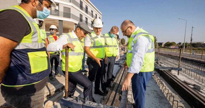 İzmir Büyükşehir Belediye Başkanı Tunç Soyer Çiğli Tramvayı inşaatındaki çalışmaları inceledi. Evka-5 kavşağında süren imalatlar ile ilgili İzmir Büyükşehir Belediyesi Raylı Sistem Dairesi Başkanı Mehmet Ergenekon’dan bilgi alan Başkan Tunç Soyer, bölgedeki çalışmalar kapsamında tramvayın ilk raylarının döşendiğini müjdeledi. “İzmir’i demir ağlarla örüyoruz” vizyonuyla yola çıktıklarını belirten Soyer, “Bugün o demir rayları montajı başlamış olarak görmek, yüreğimize su serpiyor. Pandemiye rağmen, sıcak havaya rağmen arkadaşlarım hiç aksatmadan çalışmalarını sürdürüyor. Bundan büyük gurur duyuyorum” dedi.